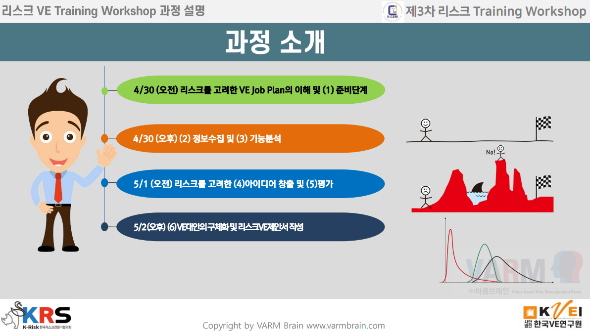 [훈련주제] 리스크를 고려한 VE Job Plan의 이해 및 준비단계 * 09:00~09:30 행사 등록 및 참여자 소개 * 09:30~10:00 개요/Training Workshop 계획 설명 * 10:00~11:00 SAVE/워싱턴주VERA 개념 설명 * 11:00~12:00 실제 PJ의 원가 및 일정 등 Baseline 선정 |