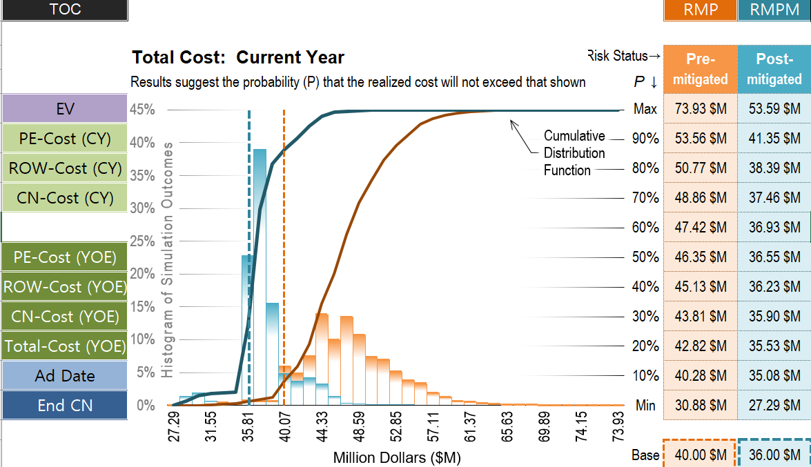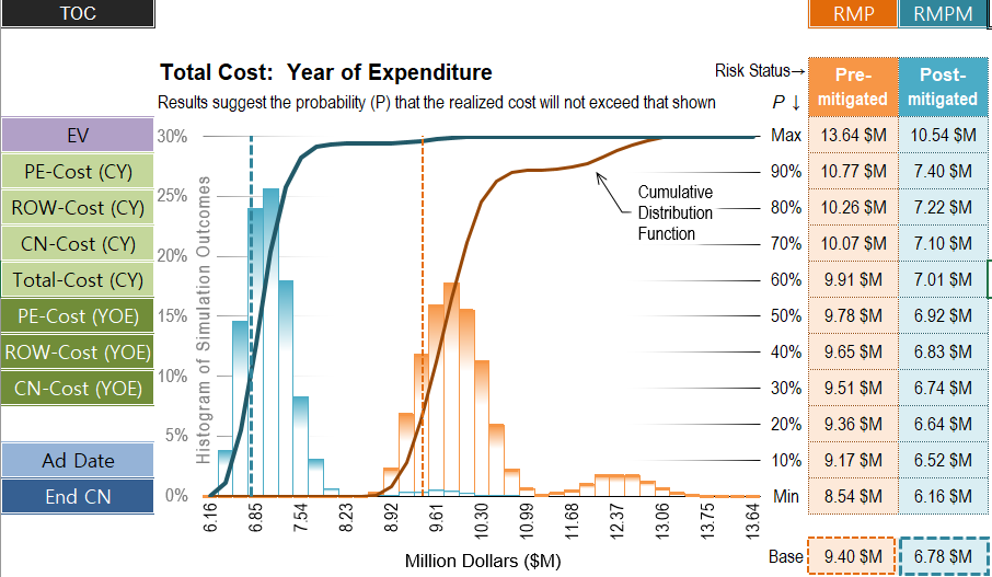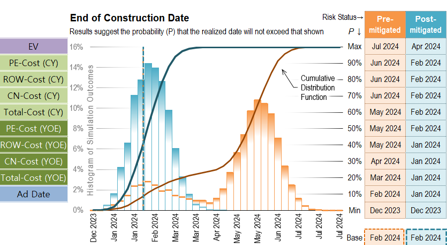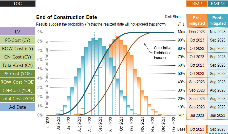 < OO 아파트 토공현장의 총사업비와 준공일의 정량적 리스크분석 결과 >