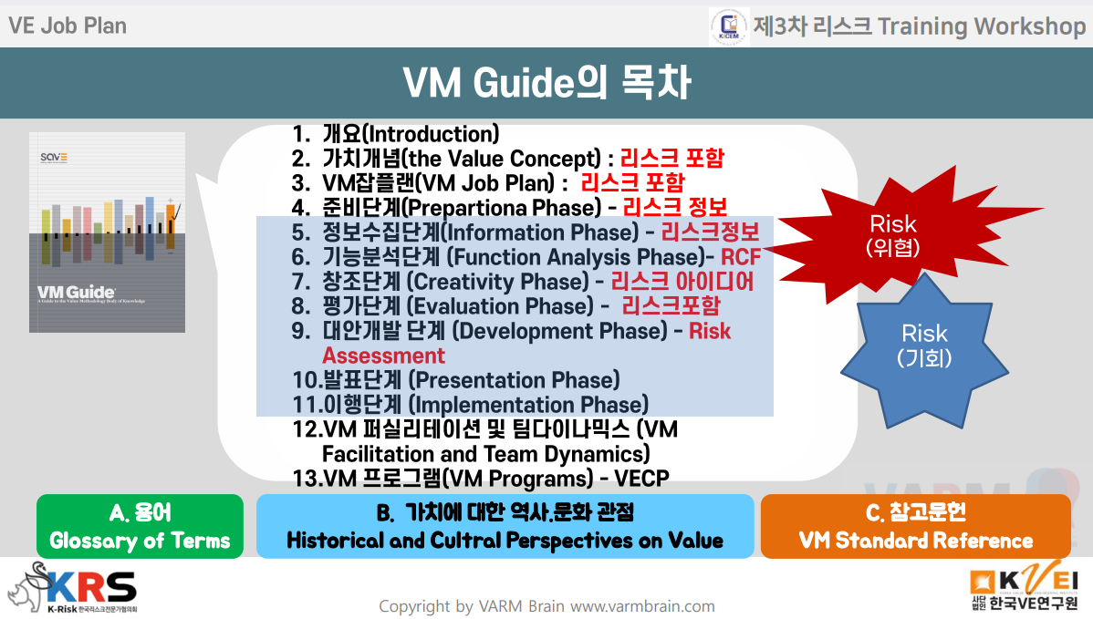 국제VE협회인 SAVE International의 최근 VM Guide 에서는 "리스크"를 가치의 구성요소, 원가의 기본요소로 보고 리스크잡플랜 전단계에서 활용할 것을 권고하고 있으며, 글로벌 국가의 많은 전문가들이 VE과정 속에서 가장 중요하게 고려할 항목중 하나로 "리스크"를 지목하고 있습니다.