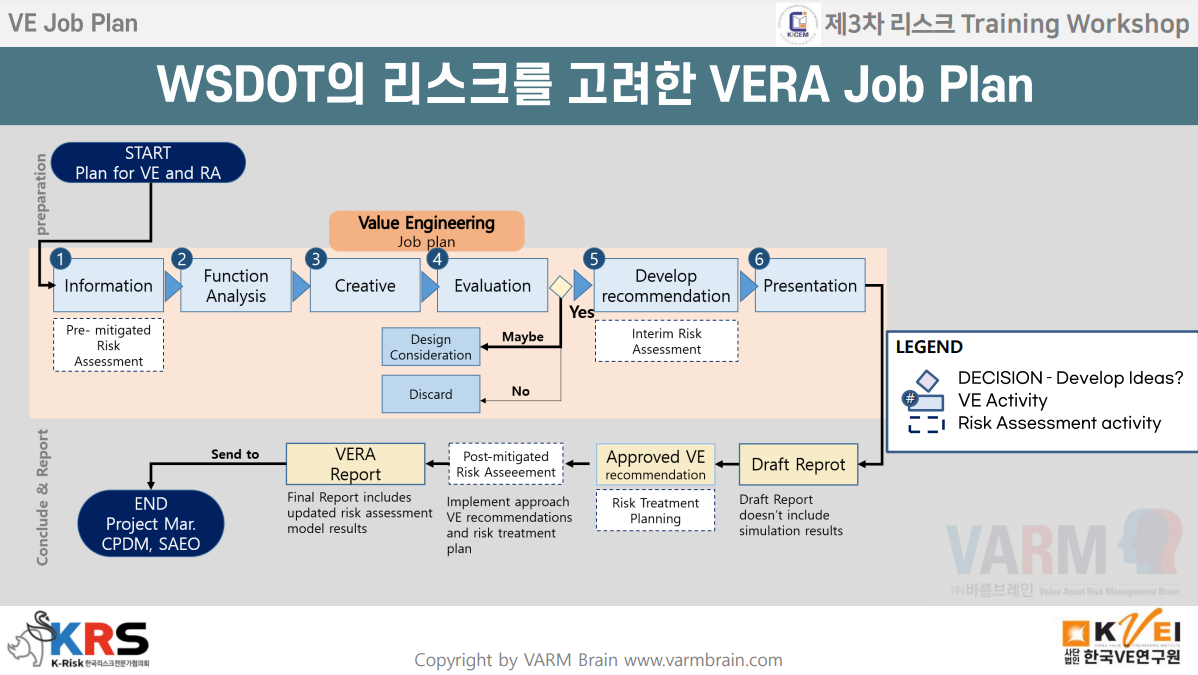 금번 아래와 같이 수행한 Training Workshop은 이러한 리스크VE의 높은 기술수준을 자랑하고 있는 미국 워싱턴주교통부의 VERA 접근법, 미국 최고컨설팅 회사인 VMS의 FDRM 기법 등의 이해를 바탕으로 VE Job Plan 전 과정에서 어떻게 리스크 정보를 처리하고 관리하는지를 실제 PJ 선정 VERA 워크숍팀을 구성하여 진행해 보므로써 VE의 수행 역량을 높일 수 있도록 기획하였습니다.